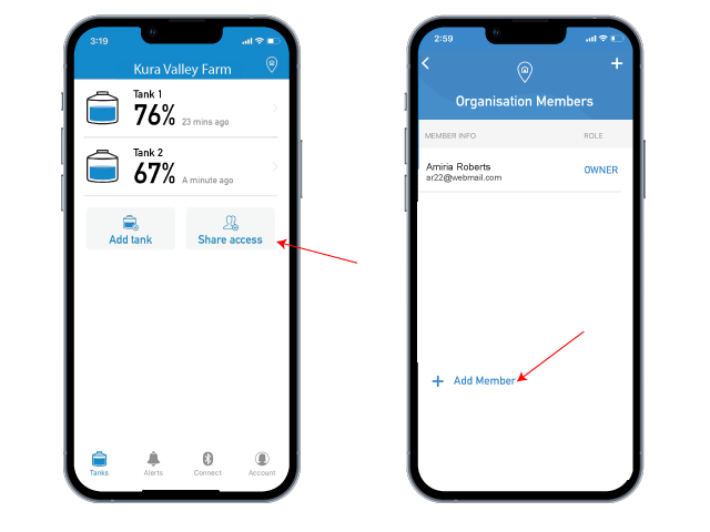 Select 'Add Member' and enter their email address. Add their name and mobile number, or they can choose to add their personal settings when they accept your invitation.